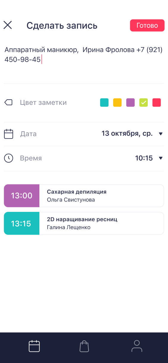 При выборе мастера клиент сразу видит свободные окошки в расписании и выбирает удобное для себя время.