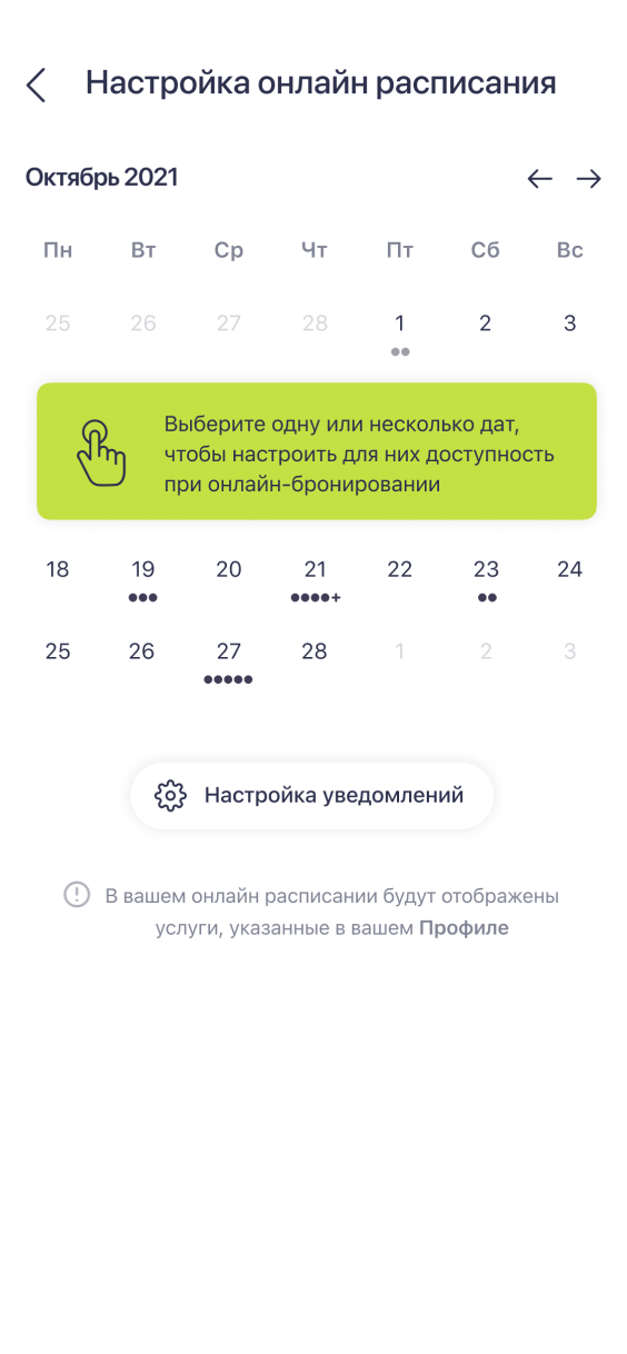 Расписание можно настраивать. Например, выделять дни или время, в которые нет возможности принимать клиентов или делать автоматические перерывы между ними. А еще можно добавлять туда личные события: от визита к врачу до напоминания о подаче показаний счетчиков.