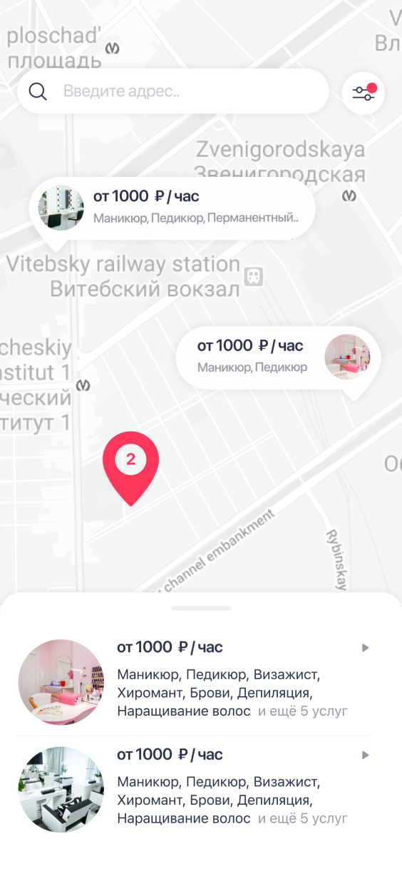 Клиент может легко найти мастера по разновидности услуги, имени или адресу. Есть фильтры для быстрого поиска, например, по ценовому диапазону. Также мы интегрировали Яндекс Карты, чтобы можно было найти мастера поблизости.