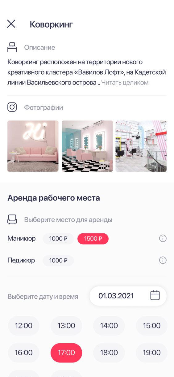 Заказчику и нам хотелось, чтобы приложение полностью закрывало все потребности мастеров. Поэтому мы внедрили в приложение раздел, где можно сдать или арендовать место в коворкинге. Для арендодателей нужно всего лишь заполнить информацию о коворкинге, а для тех, кто хочет снять место на время, забронировать и оплатить.