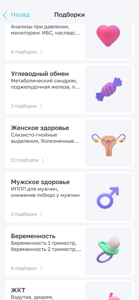 Подборки. Удобный инструмент для поиска нужного анализа исходя из заболевания или системы органов.