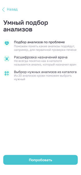 Если пользователь не знает, какие анализы ему следует сдать, то приложение подберет для него индивидуальную корзину на основании симптомов и жалоб. Нужно лишь ответить на вопросы анкеты о своем здоровье, чтобы получить список рекомендаций.