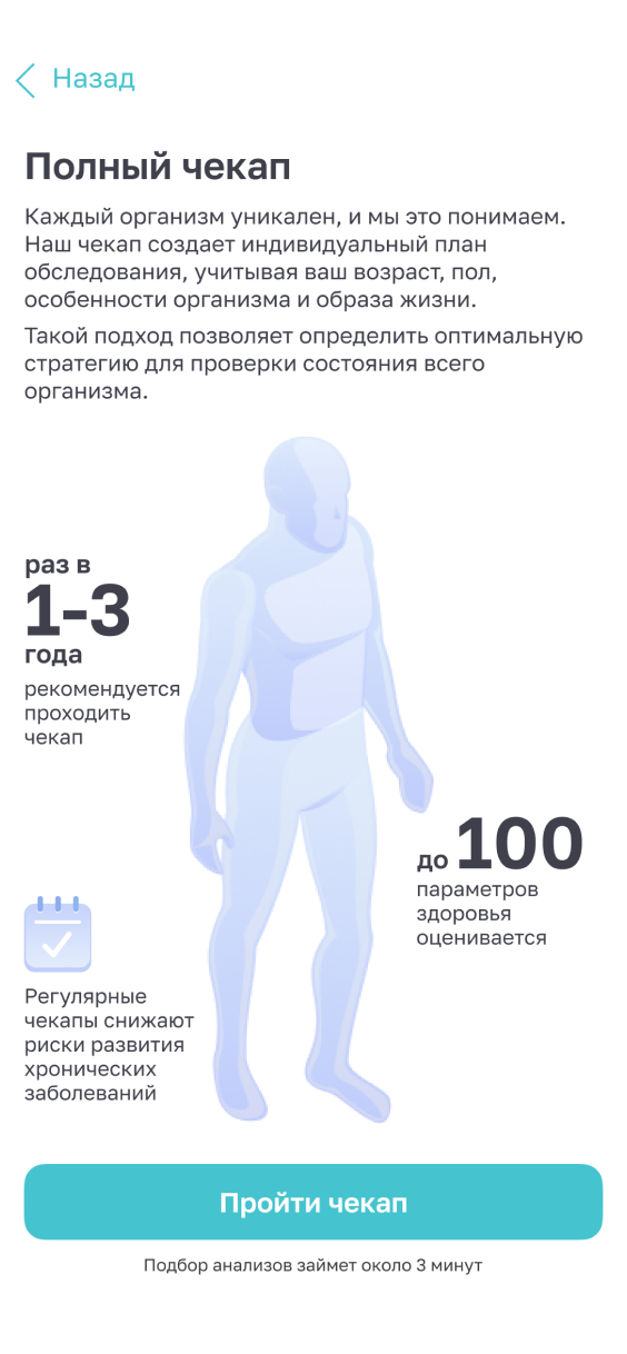 Поэтому мы сделали чекапы для проверки состояния здоровья с индивидуальным подбором анализов. Например, полный чекап всех систем организма или профилактика диабета.