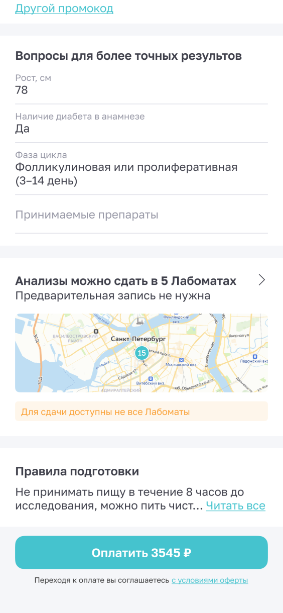 Мы интегрировали в приложение платежные системы и Яндекс Карты, чтобы можно было сразу оплатить заказ и выбрать удобное место для сдачи анализов.