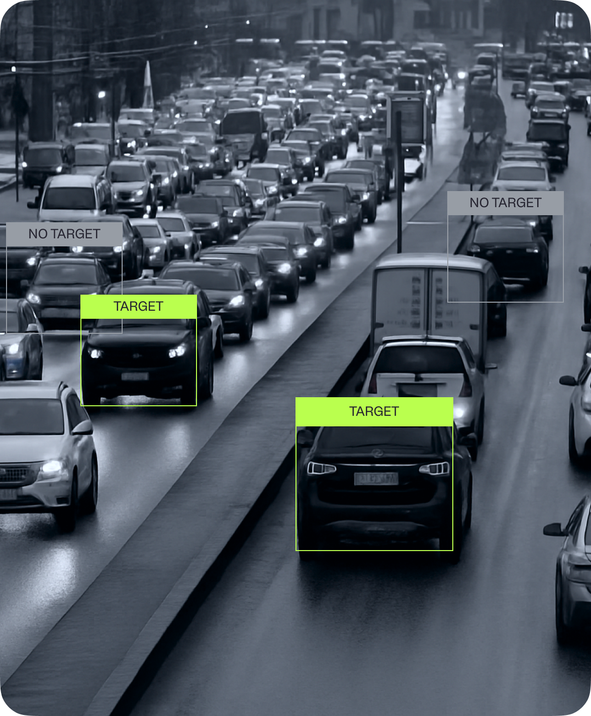 Наше программное обеспечение отслеживает целевую аудиторию рекламодателя и показывает рекламу только тогда, когда она проезжает мимо билборда. Суммарное время детекции, распознавания и анализа аудитории занимает менее 0,5 сек. Камера также считывает скорости движения автомобилей и анализирует время контакта с рекламным сообщением.