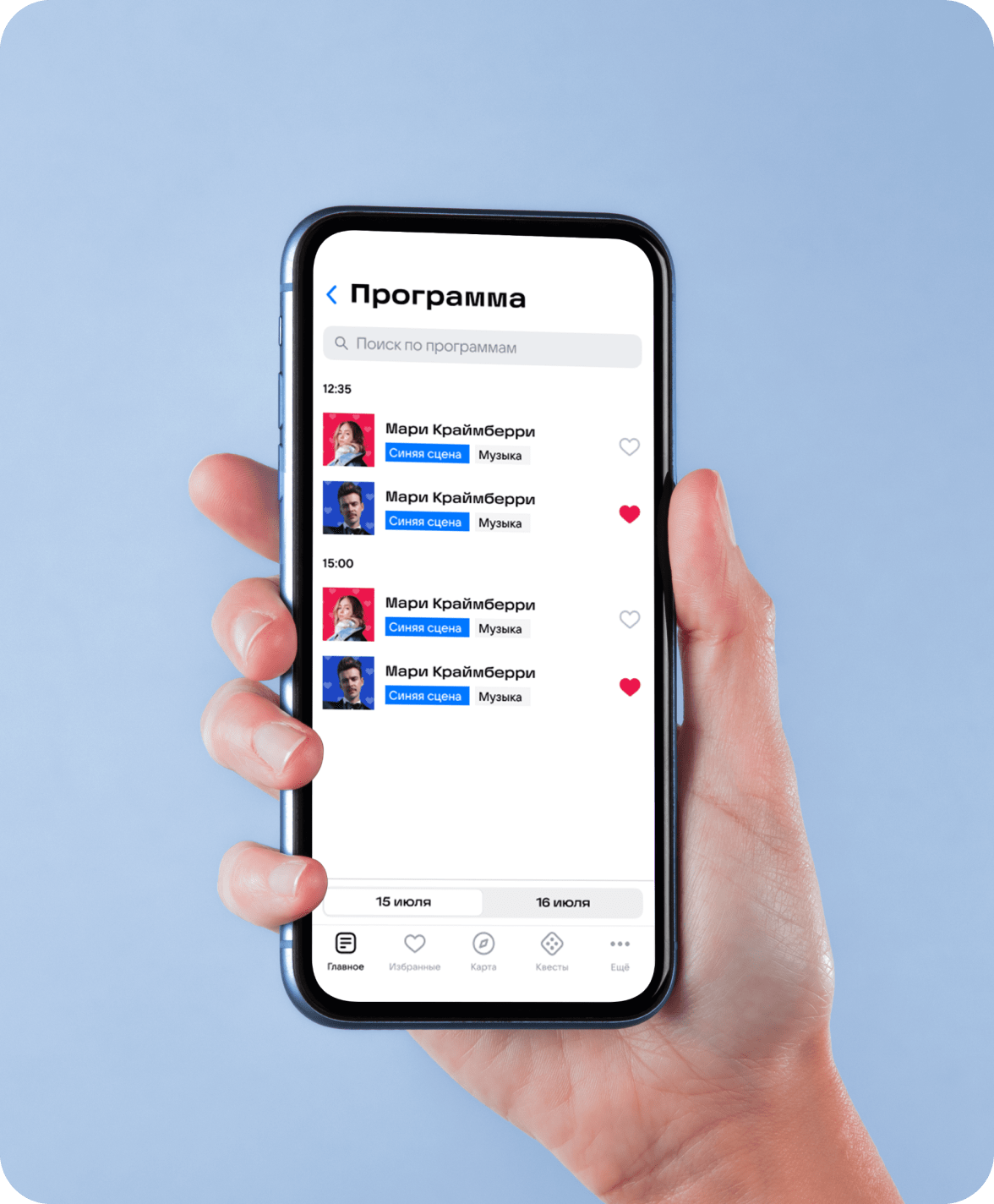 У фестиваля насыщенная программа: в ней уместились десятки концертов, лекций, мастер-классов и других мероприятий. Часто все они идут параллельно друг с другом. Нам было важно, чтобы участникам фестиваля было легко сориентироваться во всех активностях и выбрать то, что интересно именно им. Поэтому мы уделили особое внимание функции составления индивидуального расписания.