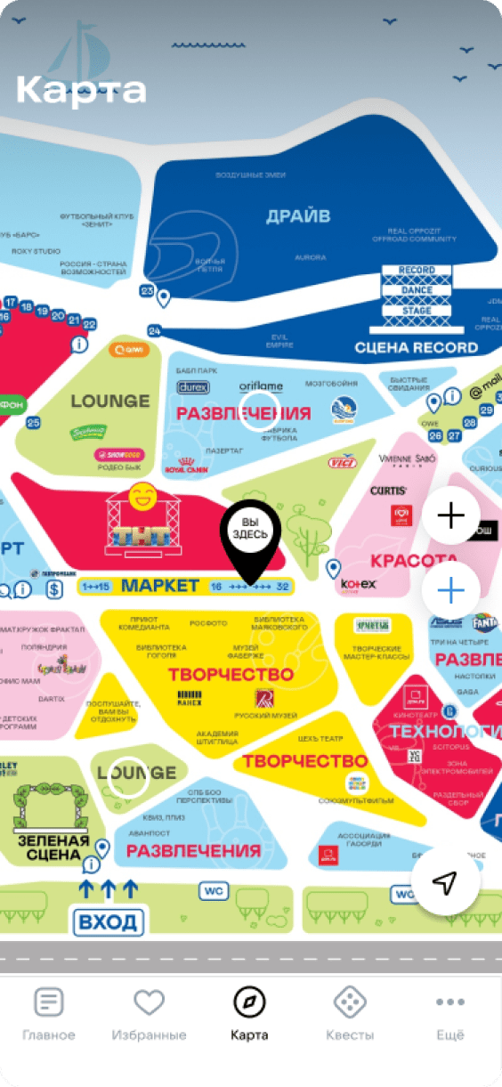 Чтобы реализовать такой пользовательский путь, самые важные разделы вынесли в тапбар. В «Карте» отображается подробная схема фестивального пространства со всеми тематическими зонами и текущее местоположение. Карта синхронизируется с «Избранным», чтобы можно было оставить только те объекты, которые пользователь заранее для себя отметил. Все для того, чтобы пользователь быстро сориентировался и нашел, куда ему идти.