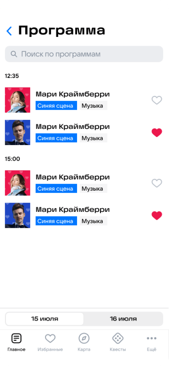 Все события поделили по группам и отобразили в разделе «Главное». В каждом из них собрали полную информацию о мероприятиях. Например, в «Музыке» находится расписание концертов — здесь можно посмотреть график выступлений по дням или по видам сцен.